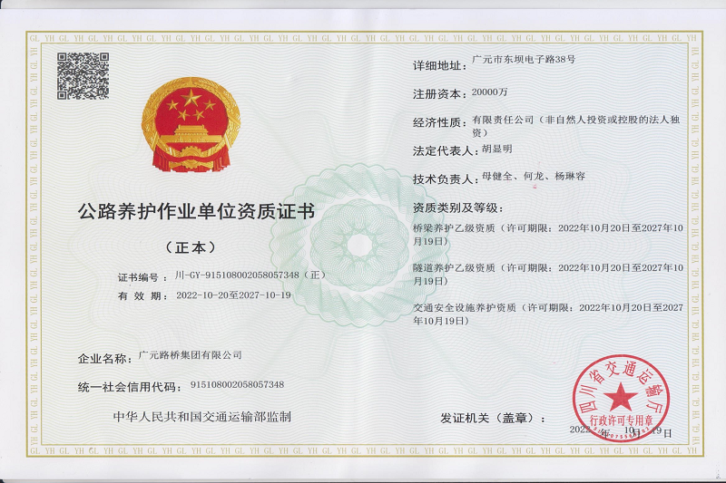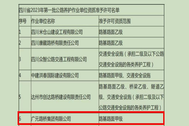 再添喜報(bào)!2023年2月16日,四川省交通運(yùn)輸廳官網(wǎng)公布了《四川省2023年第一批公路養(yǎng)護(hù)作業(yè)單位資質(zhì)準(zhǔn)予許可名單》,廣元路橋集團(tuán)有限公司位列其中。至此,廣元路橋集團(tuán)有限公司成功獲得路基路面甲級(jí)、橋梁乙級(jí)、交通安全設(shè)施、隧道乙級(jí)4項(xiàng)公路養(yǎng)護(hù)作業(yè)資質(zhì),成為我市第一家、也是唯一一家取得上述公路養(yǎng)護(hù)作業(yè)資質(zhì)的市屬國有企業(yè)。