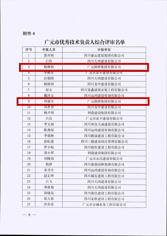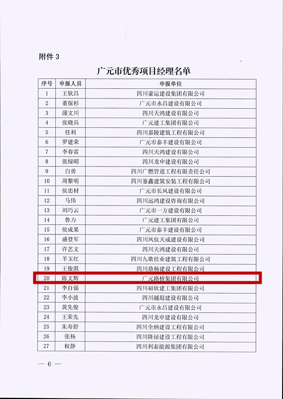 2023年7月1日,廣元路橋集團(tuán)有限公司被廣元市住房和城鄉(xiāng)建設(shè)局評為優(yōu)秀建筑企業(yè);陳文輝被評為“廣元市優(yōu)秀項(xiàng)目經(jīng)理”;母健全、楊琳容被評為“廣元市優(yōu)秀技術(shù)負(fù)責(zé)人”。